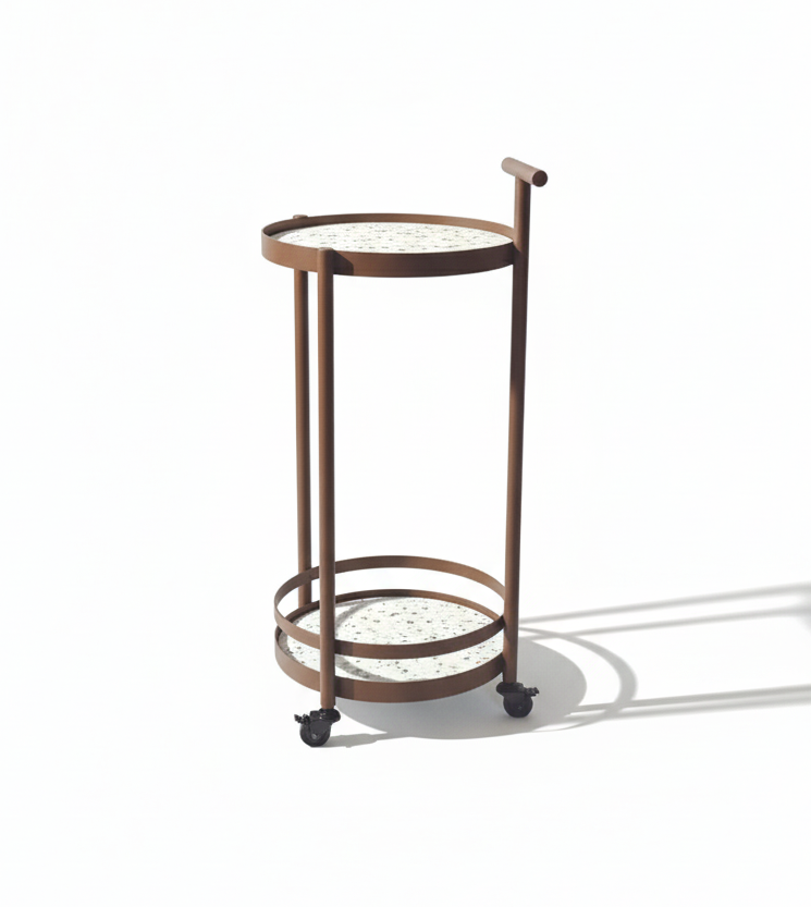 Minibar con superficies en Polyloop (plástico 100% reciclado) en 3 diferentes acabados y estructura metálica acabado en pintura electroestática en 3 diferentes colores