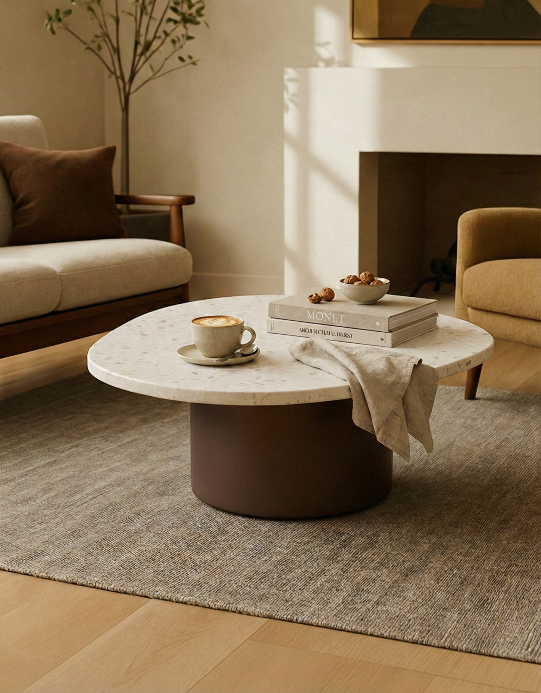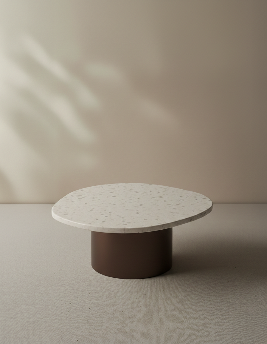 Su superficie circular y base sólida crean una presencia tranquila y elegante, pensada para integrarse con naturalidad en el espacio.
