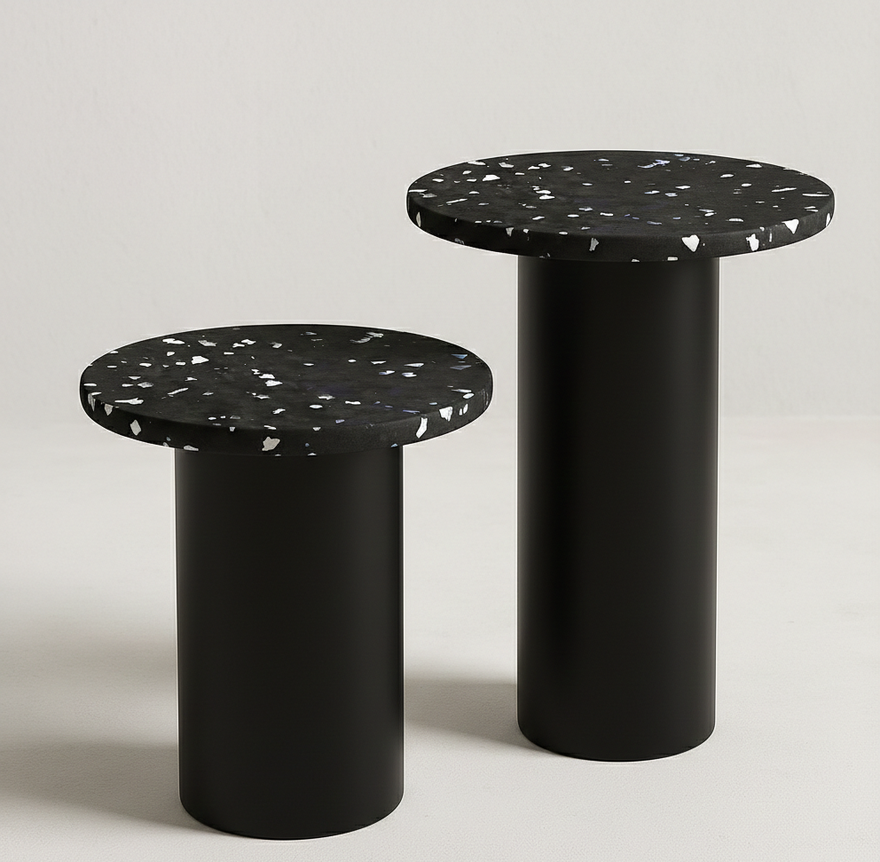 Mesas auxiliares ideales para ese rincón de la casa o entre dos poltronas, con superficie en polyloop (plastico 100% reciclado) y base cilíndrica metálica disponible en 3 colores.