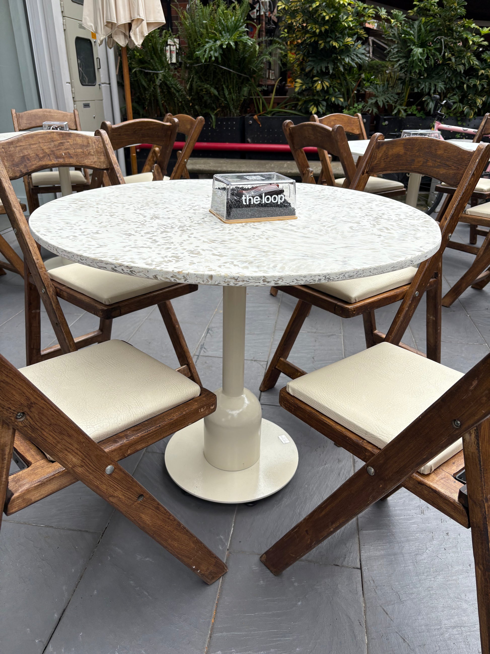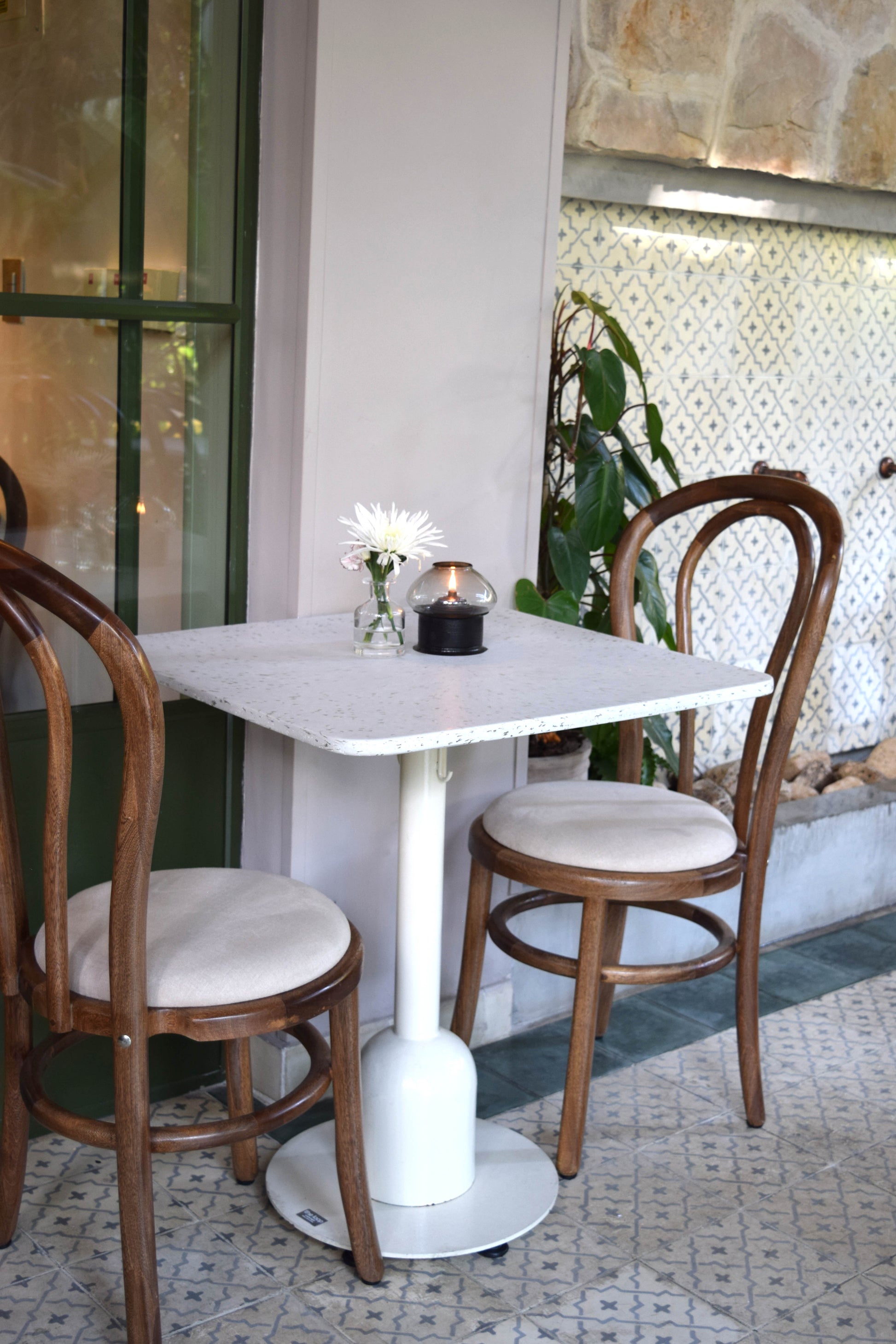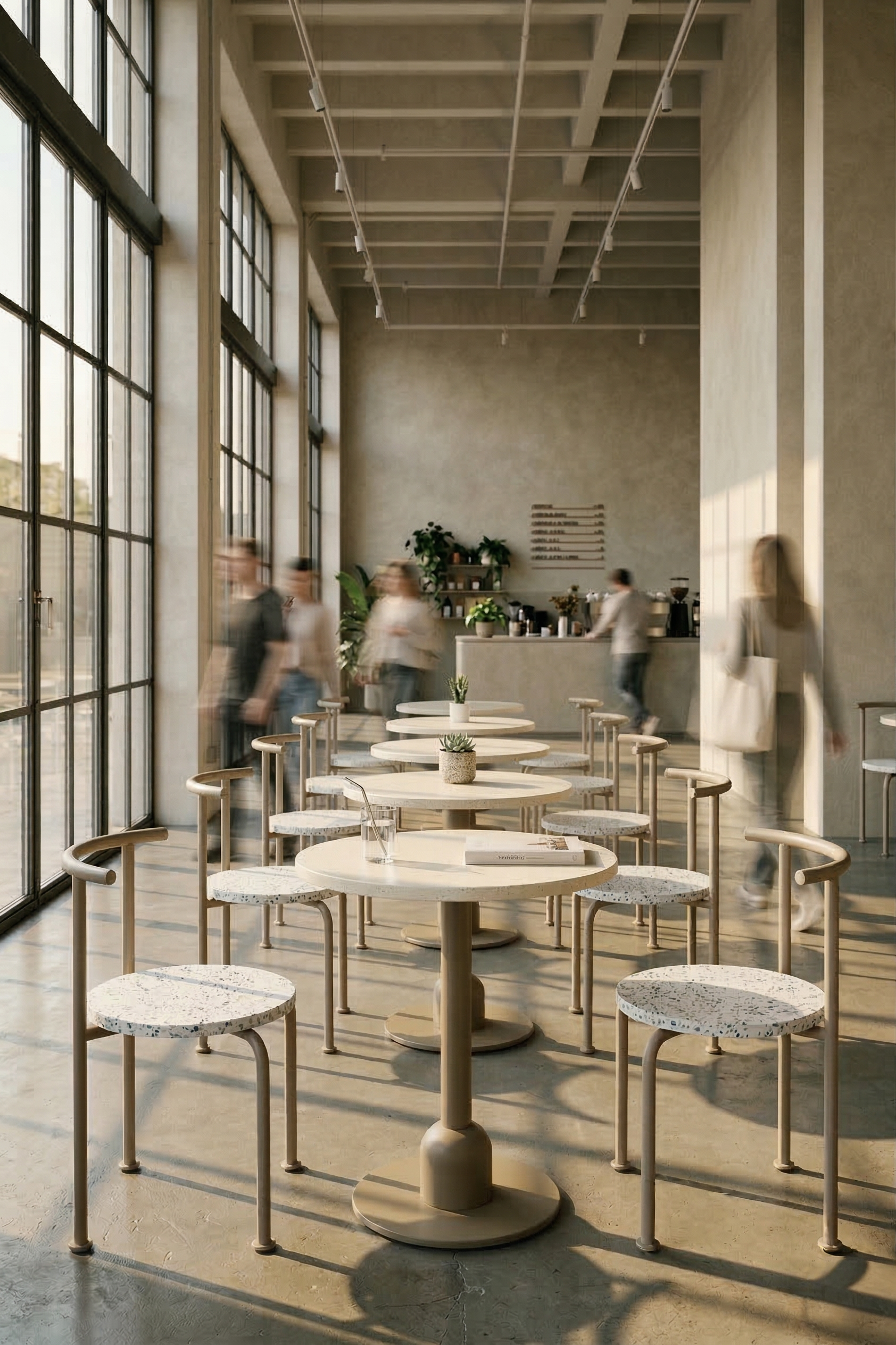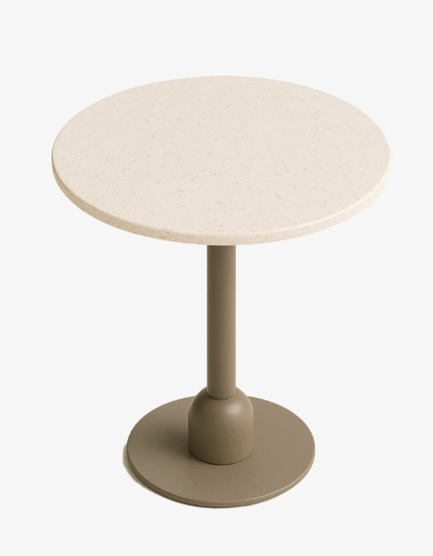 La mesa Lolla destaca por su base escultural con un sutil detalle cónico, ofreciendo una presencia firme y contemporánea. Ideal para entornos de hostelería dinámica o espacios lounge que buscan una pieza central con carácter y una estabilidad excepcional.